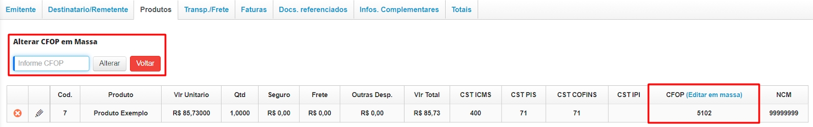 3ª – Quando estiver na tela de edição de NF-e, na aba Produtos, você poderá clicar em “Editar em Massa” no campo da CFOP, onde abrirá um novo campo onde você poderá informar o código do CFOP que desejar para essa NF-e, feito isso o sistema irá mudar a CFOP de todos os produtos que estão listados na Nota Fiscal.