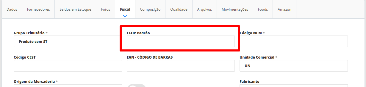 Depois disso, é possível alterar o CFOP padrão no produto, acessando o menu lateral Cadastros, submenu Produtos, onde poderá editar o produto que desejar, e em seguida acessar a aba Fiscal. Nessa tela, informe o CFOP que deseja no campo CFOP Padrão.