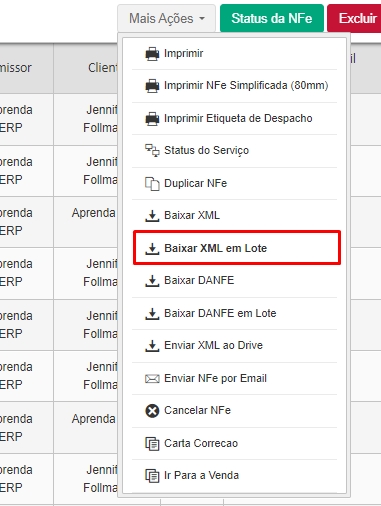 É comum que no início e fim de cada mês, a contabilidade solicite o XML das notas fiscais emitidas. Com base nessa prática, o ERP disponibiliza a funcionalidade de Download em Lote de arquivos XML.