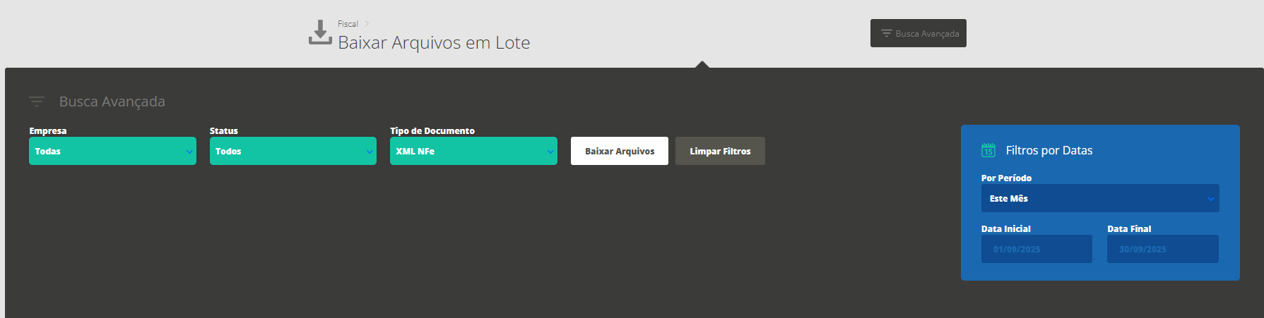 Assim, você será direcionado a página Baixar Arquivos em Lote, onde deverá selecionar a Empresa, o Status, Tipo de Documento, Período (inicial e final) que deseja baixar os documentos.