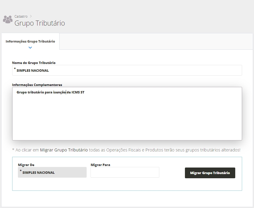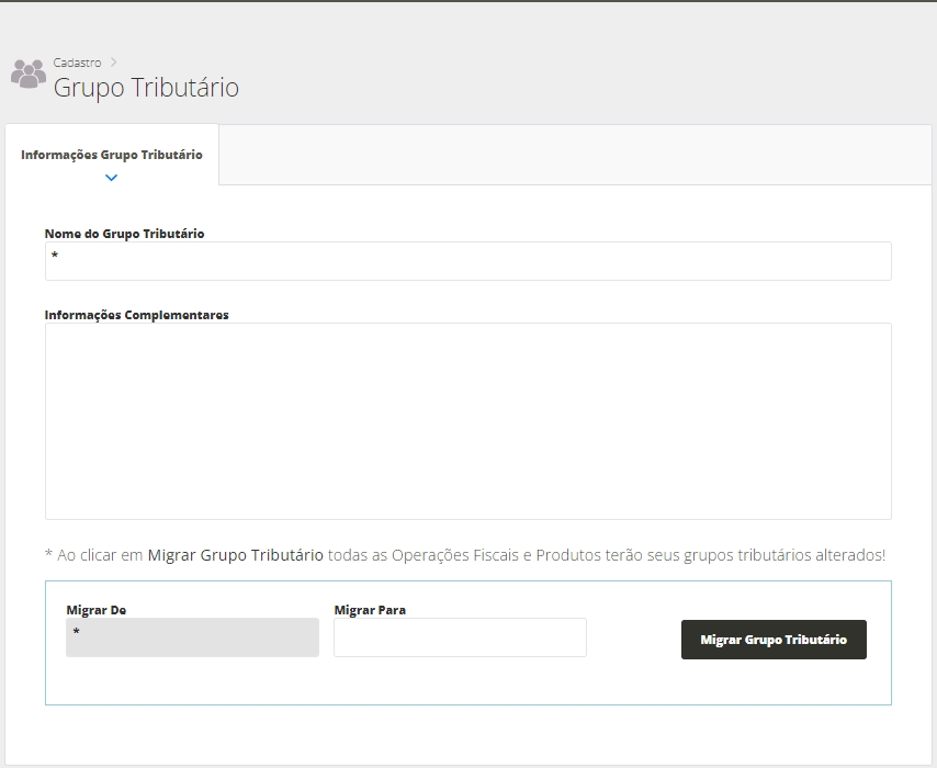 Migrar De e Migrar Para: depois de salvar o grupo tributário em questão, utilizando estas opções será possível migrar este grupo tributário para outro cadastrado no sistema. Assim, automaticamente os produtos e operações fiscais em que este grupo está informado será alterado automaticamente para o novo grupo.