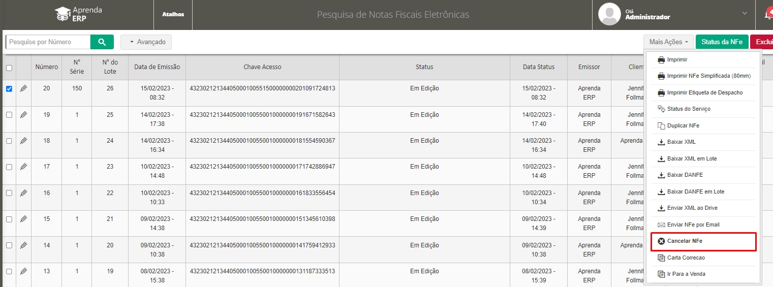 Agora, na listagem, selecione a nota que deseja cancelar, clique em Mais Ações, e em seguida, em Cancelar NFe.