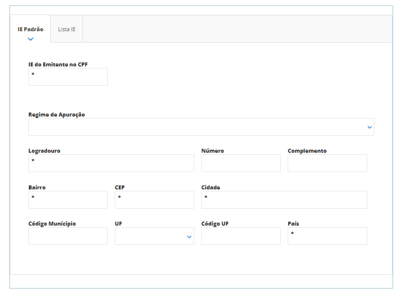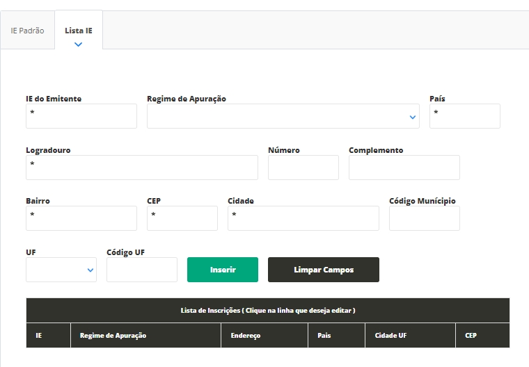 Ainda nesta tela, você verá a aba Lista IE você poderá informar todas as Inscrições Estaduais que possui com este CPF. Assim, no momento de emitir uma nota fiscal, você poderá selecionar qual IE deseja usar para a emissão da nota. Basta preencher todos os campos conforme a tela anterior e clicar em inserir.