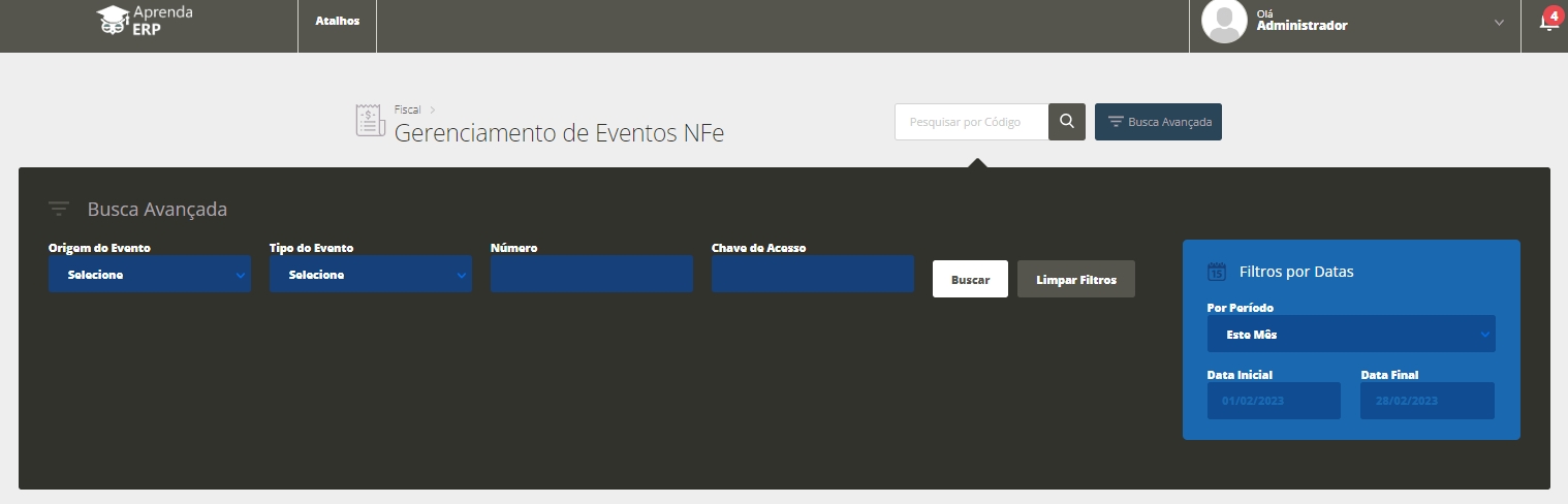 Tipo do Evento: selecione quais eventos você deseja verificar, entre carta de correção ou cancelamentos;