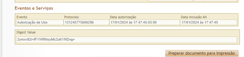 Então será possível visualizar todos os dados da nota fiscal emitida, onde no final da página é possível visualizar o evento da nota, conforme print