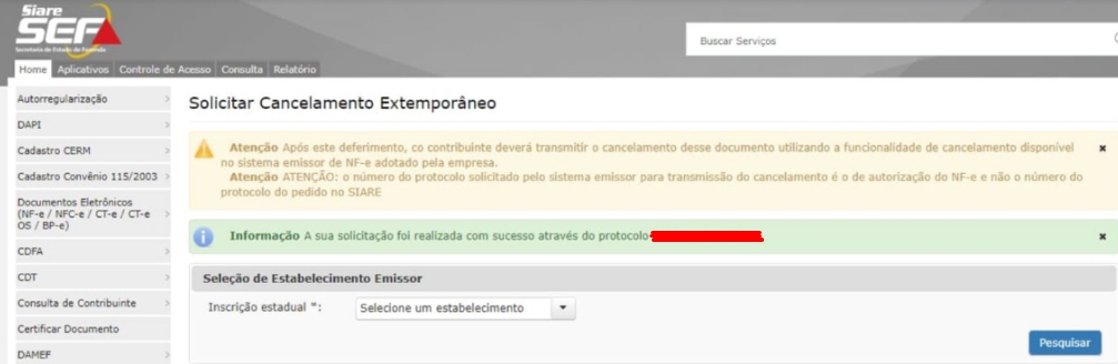 Antes de mais nada, é necessário solicitar o Cancelamento Extemporâneo junto a SEFAZ de MG, onde será gerado o número de protocolo