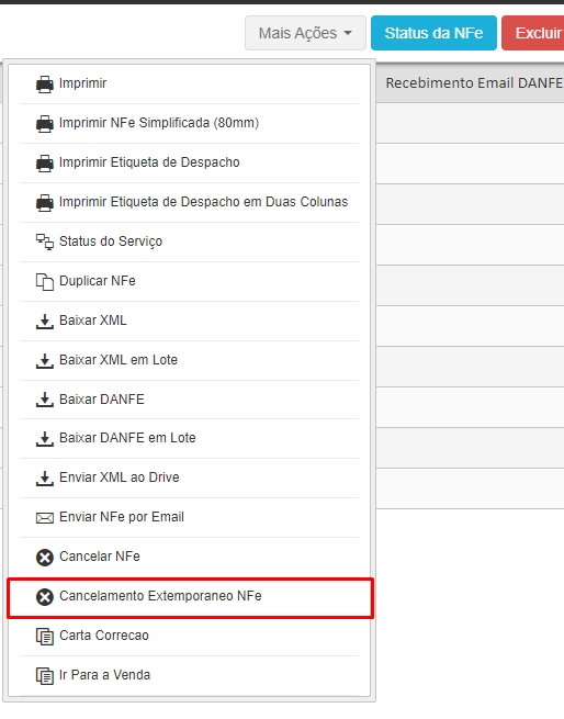 Então, clique em Mais Ações e em seguida Cancelamento Extemporâneo de NF-e