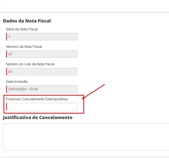 Será direcionado a tela de cancelamento de sua nota, onde irá visualizar o campo de Protocolo Cancelamento Extemporâneo