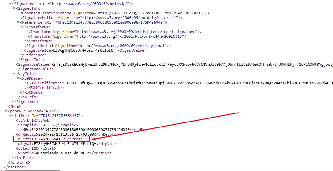 Então será aberto no navegador o XML de sua nota, direcione ao final da página. Onde será possível visualizar a tag
