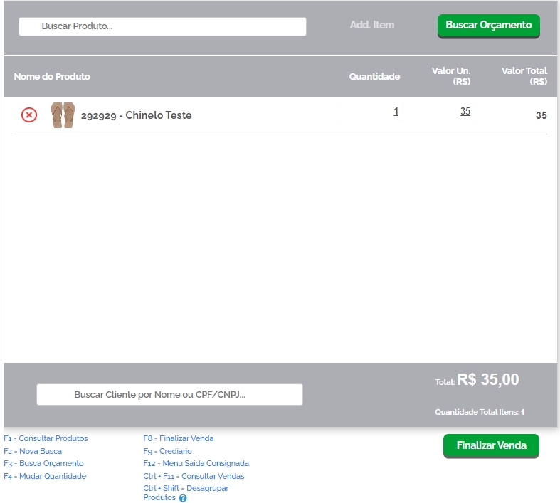 Agora, busque um produto e clique em Add. Item ou clique no botãoF6do seu teclado. Após adicionar os produtos desejados, clique em Finalizar Venda.