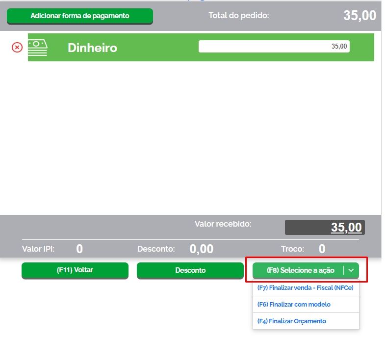 Agora, clique em Selecione Ação ou no botão F8 do seu teclado, para escolher o documento que será emitido. Clique em Finalizar Venda – Fiscal (NFC-e).