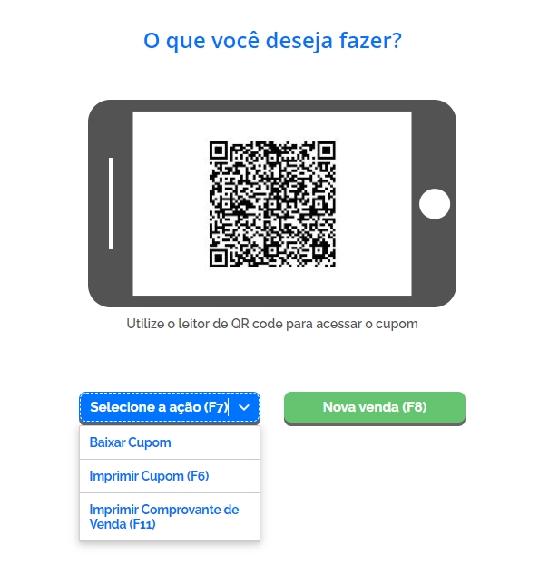 Na próxima tela, o sistema disponibilizará o QR-code para acessar o cupom eletronicamente. Agora, clique no botão Selecione a Ação e selecione a opção que mais lhe atende.