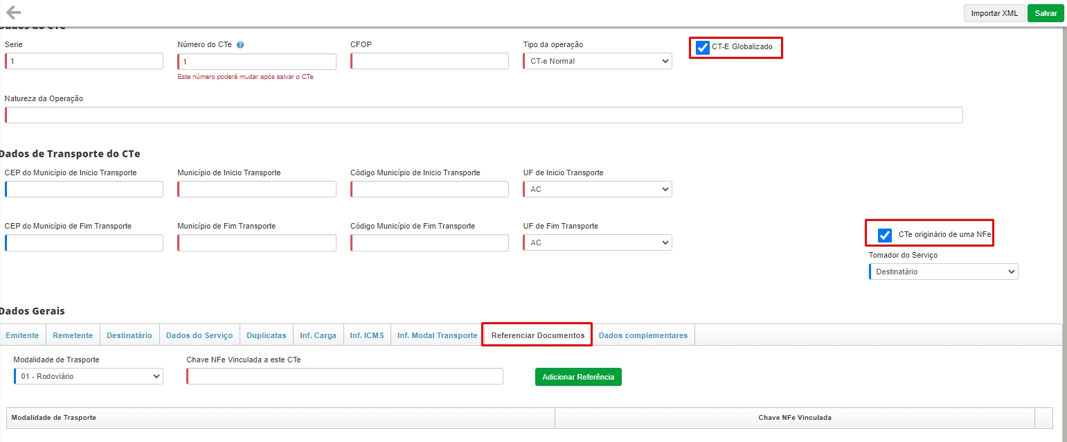 Mas além de preencher todos os campos conforme a CT-e padrão, é necessário habilitar os campos CT-e Globalizado(1) e CT-e originário de uma NF-e(2), e informar as chaves de acesso de cada NF-e(3) emitida pelo remetente. Ainda, há possibilidade de você importar todos os XMLs (4) no CT, para que sejam descritos automaticamente no documento.