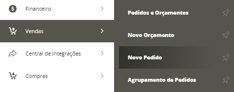 Depois disso, você deverá realizar uma nova venda utilizando esta categoria, para que somente ocorra a baixa dos produtos no depósito, mas não seja efetuado o lançamento financeiro. Portanto, acesse o menu lateral Vendas, submenu Novo Pedido.