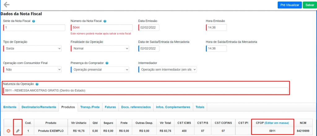 Sendo assim, você será direcionado para a tela da edição da nota fiscal, onde alguns campos já virão preenchidos conforme a venda realizada, como emitente, destinatário e produtos. Mas de qualquer forma, você deve alterar a Natureza da Operação para um CFOP correspondente a nota que está emitindo, neste caso estamos utilizando o CFOP 5911, referente a amostra. Você também deve inserir o CFOP na aba dos Produtos, de acordo com a Natureza da Operação. Ainda nesta tela, edite o produto e determine as tributações de ICMS, PIS, COFINS e IPI.