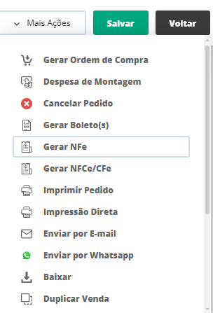 Assim, o status da sua venda passará para Pedido Aprovado sem Faturamento, representando que somente houve a baixa no estoque dos produtos inseridos na venda. Agora você poderá gerar a nota de remessa, clicando em Mais Ações e selecionando a opção Gerar NF-e.