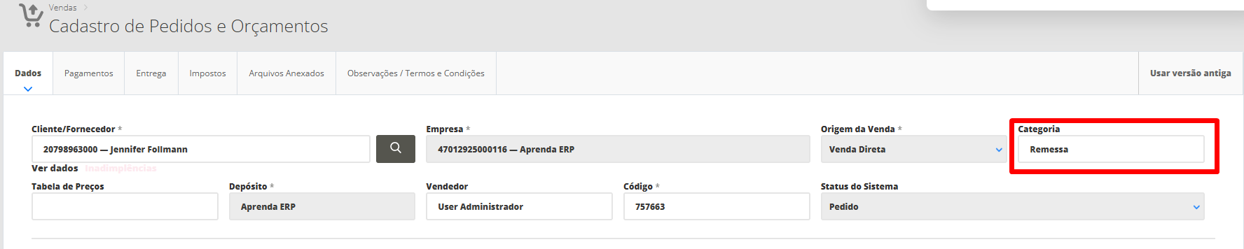 Ainda na edição da venda, você deverá ir até a seção Informações Gerias, e no campo Categoria, inserir a categoria de venda de nome "Remessa".