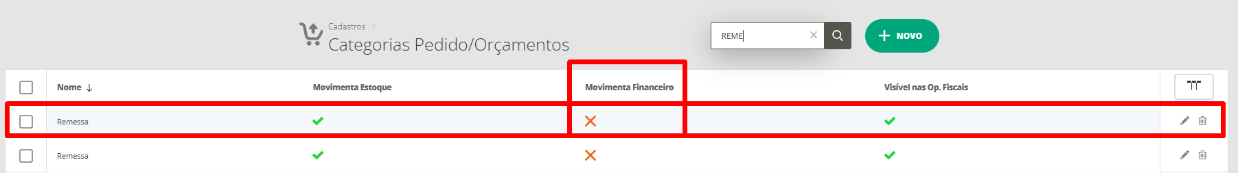 Por padrão, o sistema já tem pré-configurada uma categoria de venda com o nome remessa, que não movimenta o financeiro. Você pode conferir essa informação acessando o menu lateral Cadastros, submenu Categorias de Venda, onde na listagem já poderá verificar essa categoria. Se por acaso não houver esse cadastro, você pode adicioná-la clicando em Novo.