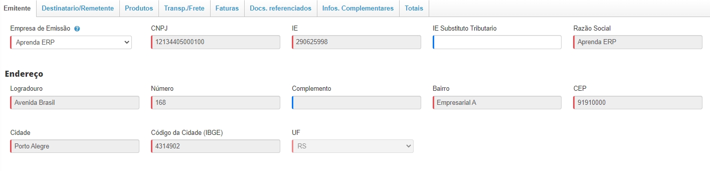 No campo Empresa de Emissão selecione a sua empresa. Feito isso, os demais dados serão preenchidos automaticamente. Estas informações serão preenchidas pelo sistema levando em consideração os dados informados no cadastro da sua empresa.