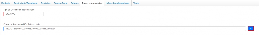 Agora, na aba Docs. Referenciados, será possível informar a chave de acesso da nota de compra fornecida pelo seu cliente. Obrigatoriamente para efetuar uma venda para cliente do tipo produtor rural, é necessário que ele emita uma nota de compra dos produtos desejados. Assim, com esta nota de compra, você deverá informar a chave de acesso da mesma no campo Chave de Acesso da NF-e Referenciada. Informe a chave sem hífen e clique no botão Mais para adicioná-la.