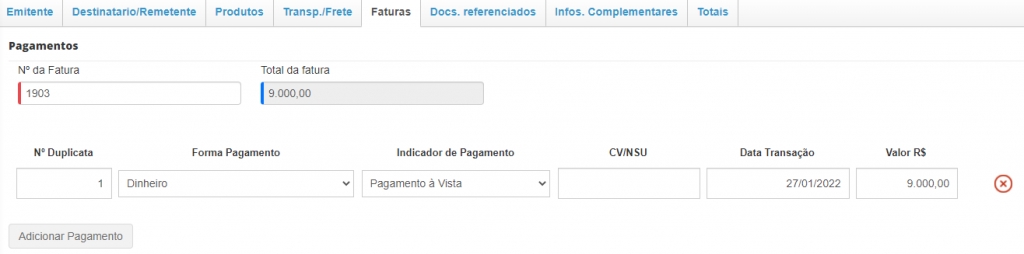 Se for necessário adicionar outras formas de pagamento, basta clicar sobre o botão Adicionar Pagamento.