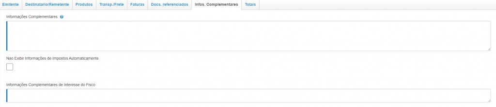 Já a opção Não Exibir Informações de Impostos Automaticamente deve ser selecionada quando as informações sobre os impostos não serão exibidas. E o campo Informações Complementares de Interesse do Fisco você poderá incluir informações gerais que podem ser de interesse do destinatário ou da SEFAZ.