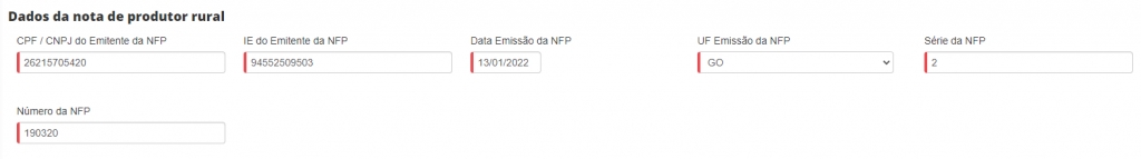 ⚠️ IMPORTANTE! Os dados NFP (Nota Fiscal do Produtor Rural) são de preenchimento obrigatório e devem ser extraídos da nota de compra fornecida pelo seu cliente. Dessa forma, insira todas as informações de acordo com NFP de compra, emitida pelo produtor rural.