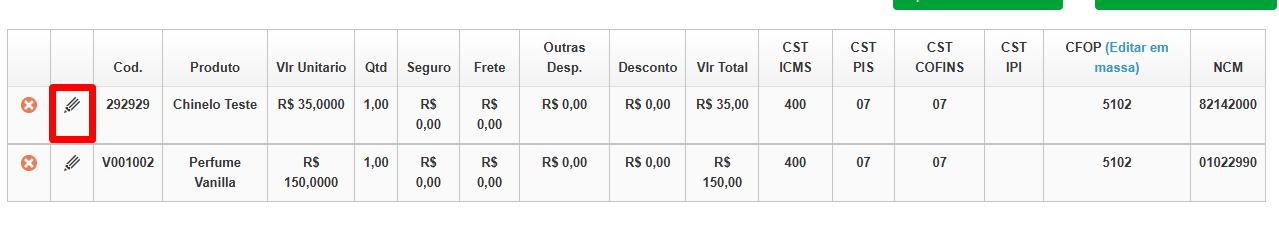 Em seguida, na aba Produtos, informe os produtos a serem vendidos e suas respectivas quantidades. Além disso, não se esqueça de informar os dados fiscais clicando no ícone de lápis localizado no início das descrições de cada produto. Assim, você poderá alterar o CFOP, NCM, quantidade e diversos fatores dos produtos vendidos.