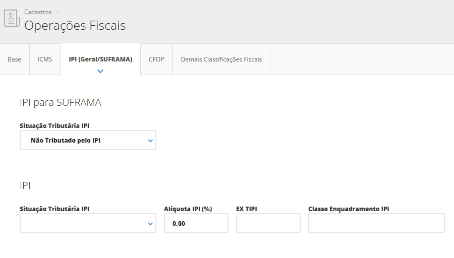 Depois disso, vá até a aba IPI Geral/Suframa e preencha a Situação do IPI, caso esteja configurando a operação fiscal para um estado pertencente à Zona Franca de Manaus ou de forma geral.