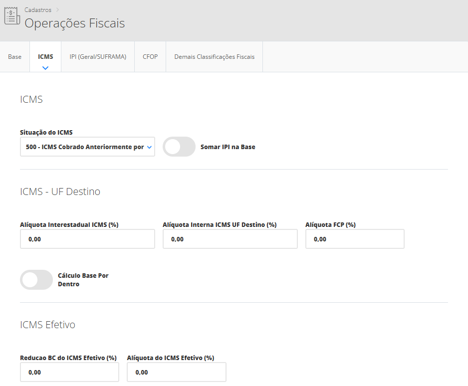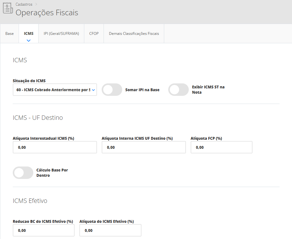 Seguindo nosso exemplo, primeiramente vamos cadastrar a operação fiscal com os dados tributários dos produtos sem ICMS ST. Portanto, será necessário acessar o menu lateral Fiscal, submenu Operações Fiscais. Na sequência, clique em Novo. Assim, se abrirá um novo modal onde você poderá definir as tributações.