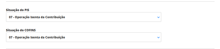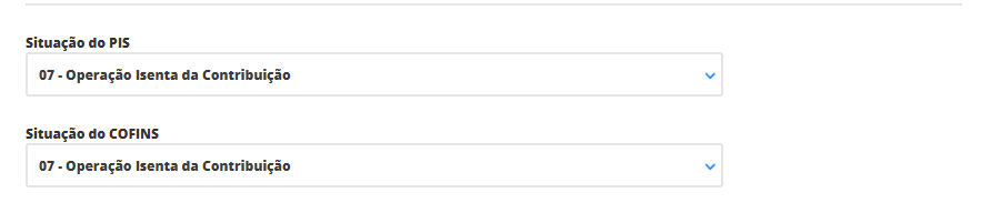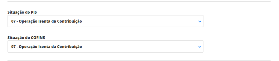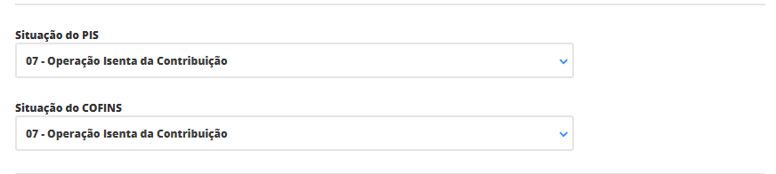 Aqui, selecione a situação de cada imposto e as respectivas alíquotas que terão seus produtos. Mas é importante confirmar estas informações com sua contabilidade para que não ocorra futuros problemas. Neste exemplo, estamos utilizando a situação 07, referente a operação isenta da contribuição destes impostos.