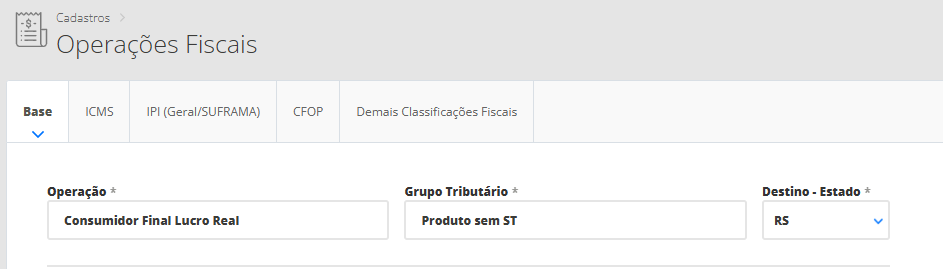 👉 Mas para a empresa Lucro Real, você precisará cadastrar a primeira operação fiscal com o nome de “Consumidor Final Lucro Real” e o grupo tributário como “Produtos sem ST“, e informar a tributação para estes produtos sem ICMS ST. Já a segunda operação fiscal será cadastrada com o nome “Consumidor Final Lucro Real” e o grupo tributário como “Produtos com ST“, com as tributações dos produtos com ST.
