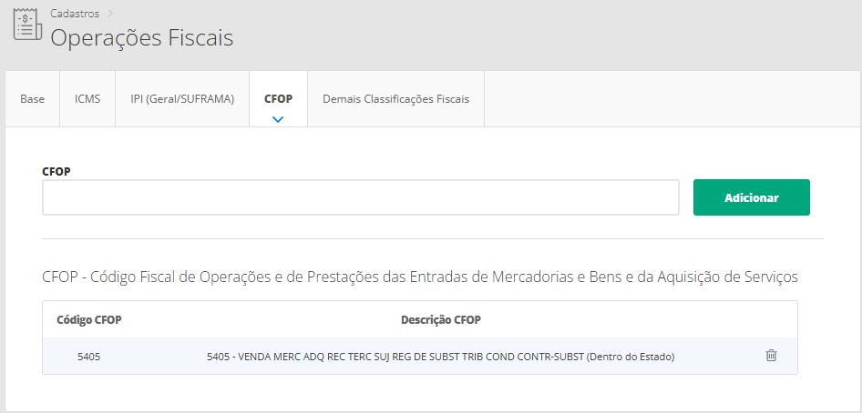 Por fim, na aba CFOP você poderá informar um CFOP que corresponde as vendas dos produtos na nota fiscal.