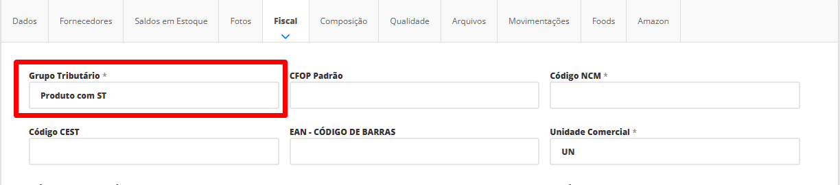 Já no produto que possui ICMS ST, é necessário informar o grupo tributário “Produtos com ICMS ST”. Portanto, acesse o menu lateral Cadastros, submenu Produtose edite o produto que possui ICMS ST. Na tela de edição do produto, clique sobre a aba Fiscale no campo Grupo Tributário, informe o nome do grupo tributário cadastrado na etapa 2. No nosso exemplo, iremos informar o nome Produtos com ICMS ST. Por fim, clique em Salvar.