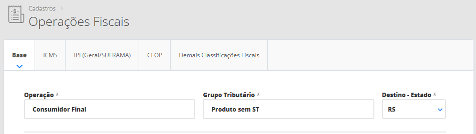 Grupo Tributário: selecione o grupo tributário cadastrado anteriormente no passo 2. Assim, no próximo passo, você terá que informar este grupo nos seus produtos para que o sistema vincule as mercadorias com a operação fiscal. Neste caso, você irá selecionar o grupo tributário “Produtos sem ICMS ST“.