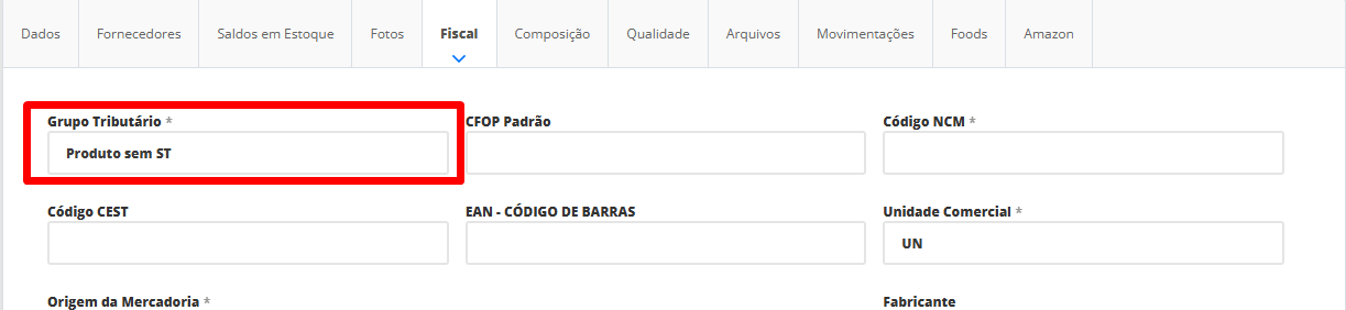 Para isso, acesse o menu lateral Cadastros, submenu Produtos e edite o produto que não possui ICMS ST. Na tela de edição do produto, clique sobre a aba Fiscal e no campo Grupo Tributário, informe o nome do grupo tributário cadastrado na etapa 2. No nosso exemplo, iremos informar o nome Produtos sem ICMS ST. Por fim, clique em Salvar.