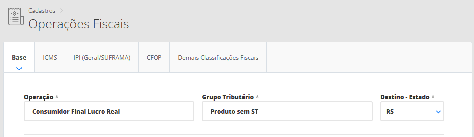 👉 Mas para a empresa Lucro Real, você precisará cadastrar a primeira operação fiscal com o nome de “Consumidor Final Lucro Real” e o grupo tributário como “Produtos sem ICMS ST“, e informar a tributação para estes produtos sem ICMS ST. Já a segunda operação fiscal será cadastrada com o nome “Consumidor Final Lucro Real” e o grupo tributário como “Produtos com ICMS ST“, com as tributações dos produtos com ICMS ST.
