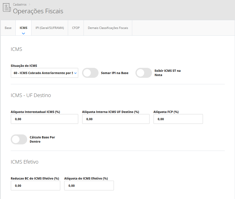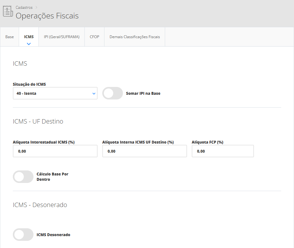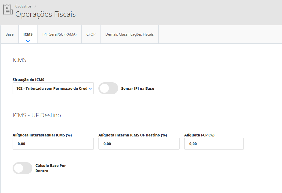Seguindo nosso exemplo, primeiramente vamos cadastrar a operação fiscal com os dados tributários dos produtos sem ICMS ST. Portanto, será necessário acessar o menu lateral Fiscal, submenu Operações Fiscais. Na sequência, clique em Novo. Assim, se abrirá um novo modal onde você poderá definir as tributações.