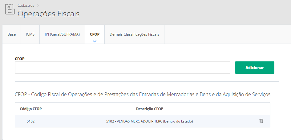 Por fim, na aba CFOP você poderá informar um CFOP que corresponde as vendas dos produtos na nota fiscal.