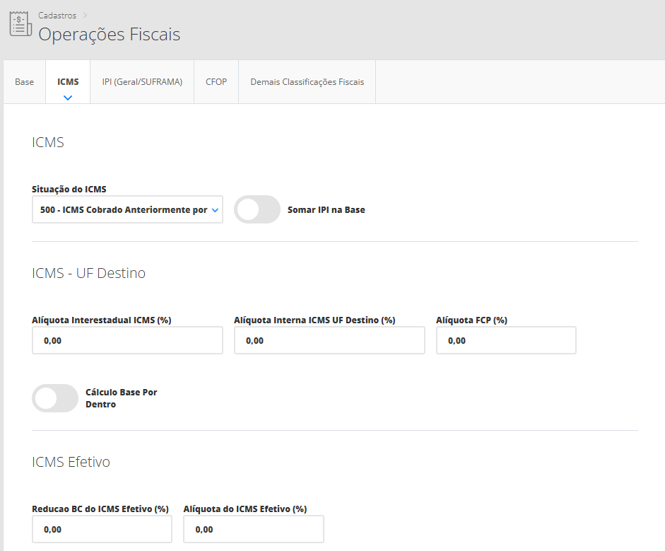 Depois disso, vá até a aba Geral / IPI para Suframa e preencha a Situação do IPI, caso esteja configurando a operação fiscal para um estado pertencente à Zona Franca de Manaus.