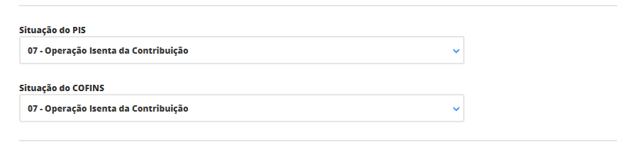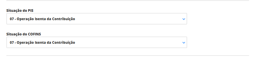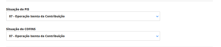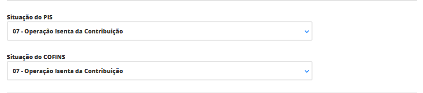Aqui, selecione a situação de cada imposto e as respectivas alíquotas que terão seus produtos. Mas é importante confirmar estas informações com sua contabilidade para que não ocorra futuros problemas. Neste exemplo, estamos utilizando a situação 07, referente a operação isenta da contribuição destes impostos.