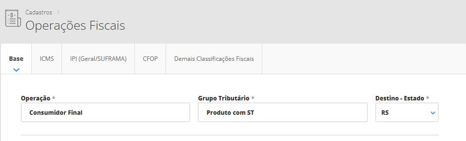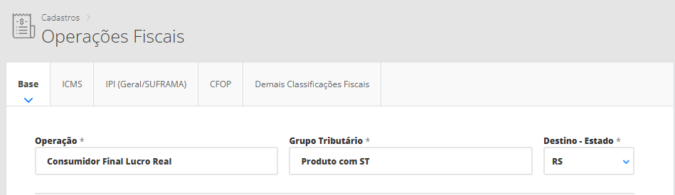 Grupo Tributário: selecione o grupo tributário cadastrado anteriormente no passo 2. Assim, no próximo passo, você terá que informar este grupo nos seus produtos para que o sistema vincule as mercadorias com a operação fiscal. Neste caso, você irá selecionar o grupo tributário “Produtos com ICMS ST“.