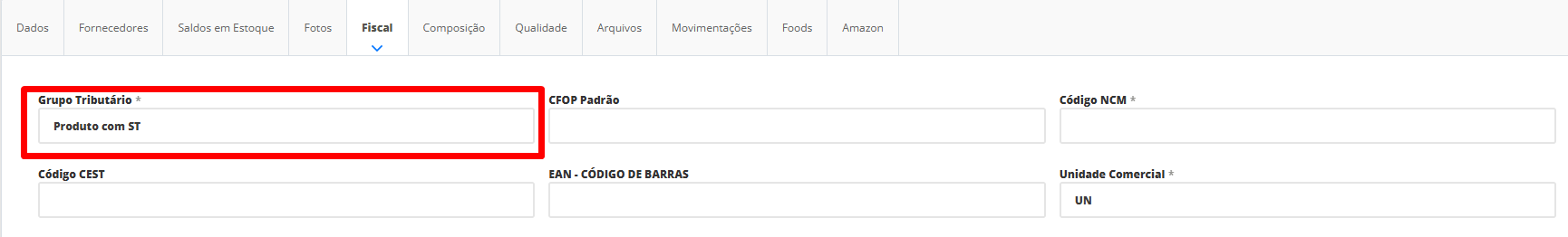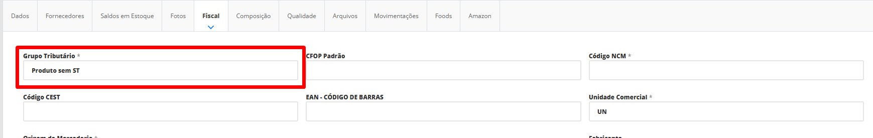 Para isso, acesse o menu lateral Cadastros, submenu Produtos e edite o produto que não possui ICMS ST. Na tela de edição do produto, clique sobre a aba Fiscal e no campo Grupo Tributário, informe o nome do grupo tributário cadastrado na etapa 2.