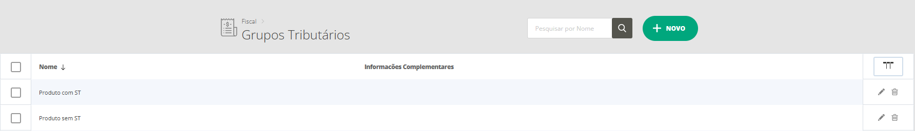 O próximo passo é criar o Grupo Tributário. Mas antes disso, é importante informar que o Grupo Tributário serve apenas para vincular o produto a uma operação fiscal, que veremos mais adiante. Portanto, você poderá aplicar o nome que deseja para este grupo. Como neste exemplo alguns produtos terão ICMS ST e outros apenas ICMS, será necessário cadastrar dois grupos tributários no sistema: um com o nome Produtos com ICMS ST e outro com o nome Produtos sem ICMS ST.