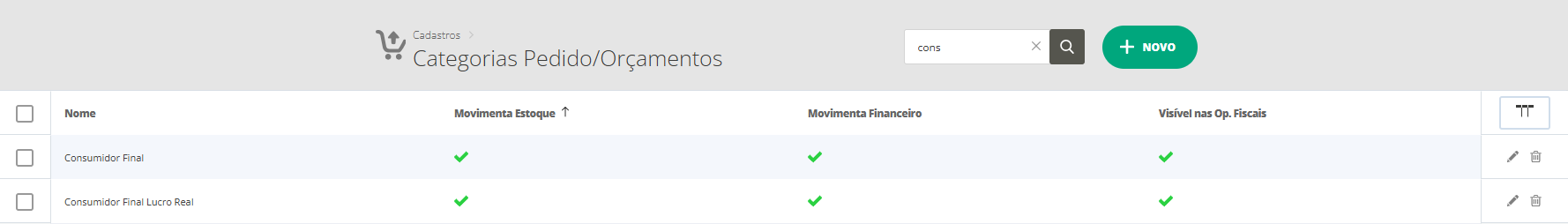 Mas para cadastrar esta segunda categoria de venda, acesse o menu lateral Cadastros, submenu Categorias de Venda e clique em Novo. Assim, se abrirá um modal onde você poderá definir o nome da Categoria de Venda (Consumidor Final Lucro Real) e marcar as opções de Visível nas Operações Fiscais, Movimenta Estoque e Movimenta Financeiro. Por padrão, a opção Visíveis nas Operações Fiscais deve ser marcada para o sistema informar os tributos na venda. Por fim, clique em Salvar.