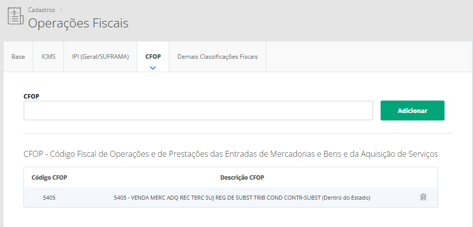 Novamente será necessário confirmar estas informações com sua contabilidade para que não ocorra futuros problemas. Após selecionar o CFOP, basta clicar em Adicionar.