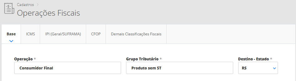No primeiro momento, o sistema apresentará a aba Base, onde será necessário informar os dados que esta operação fiscal será reconhecida pelo sistema. Portanto, preencha os seguintes dados: