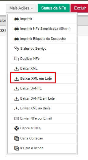 Logo, todas as notas serão apresentadas, e para dar continuidade será necessário clicar no ícone de Mais Ações e selecionar a opção Baixar XML em Lote.