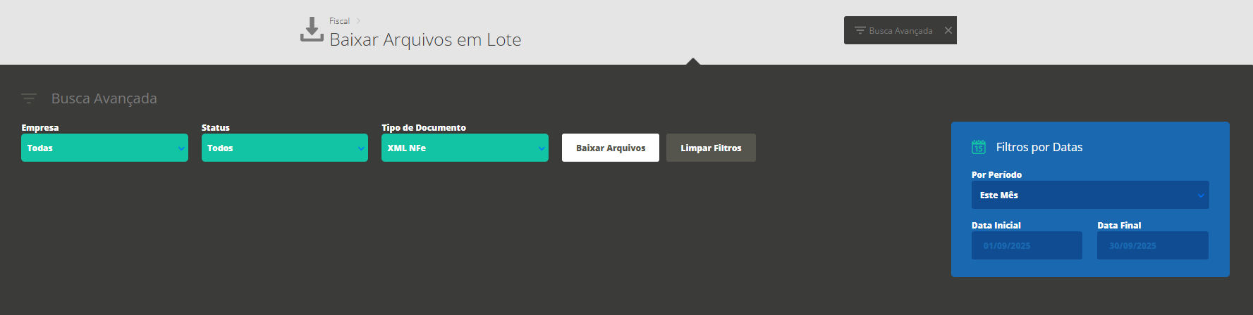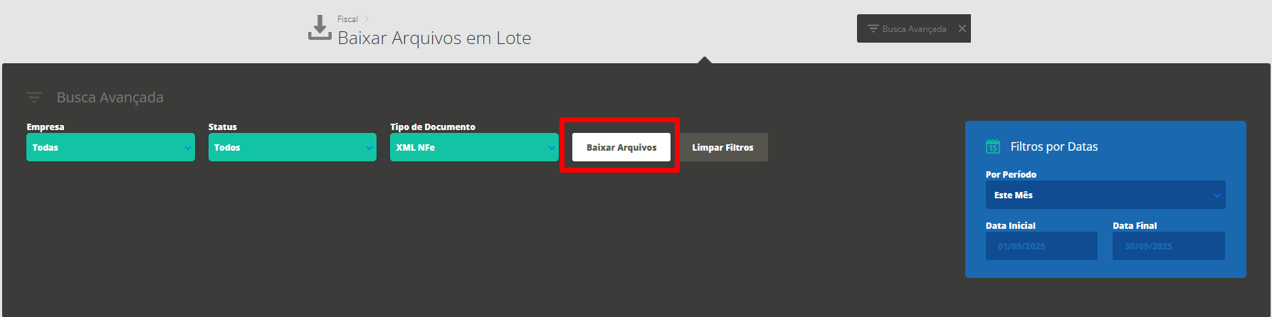 Período: informe o período de tempo no qual deseja obter os XMLs.