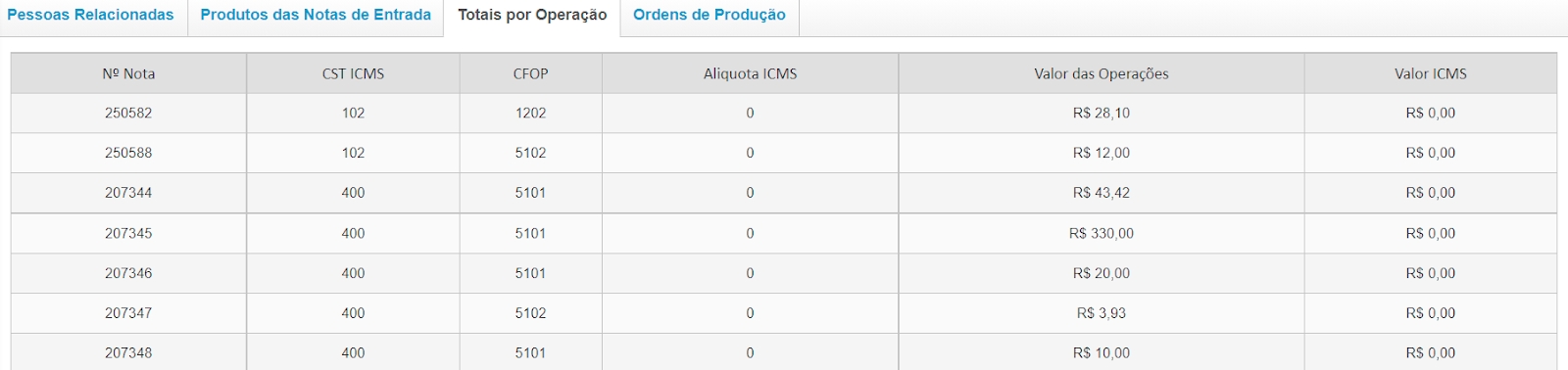 Nesta aba mostrará o valor das notas e demais descrições como Número da Nota, Situação do ICMS, CFOP, Alíquota do ICMS, Valores das Operações e Valor do ICMS.
